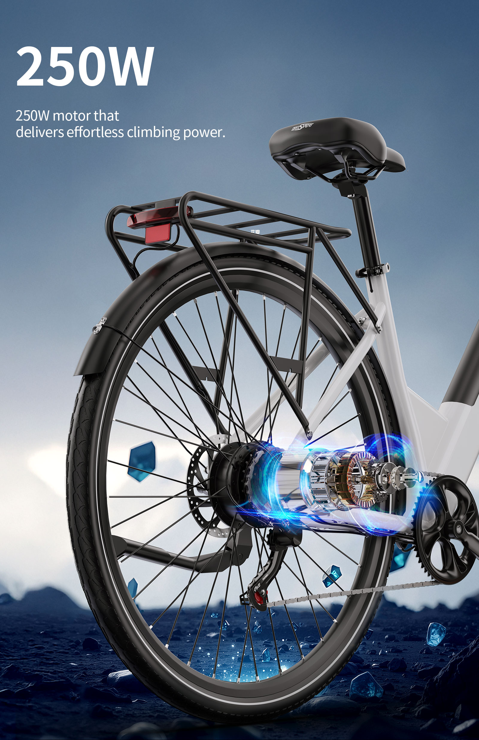Powerful 36V 250W motor with 44NM torque for smooth rides