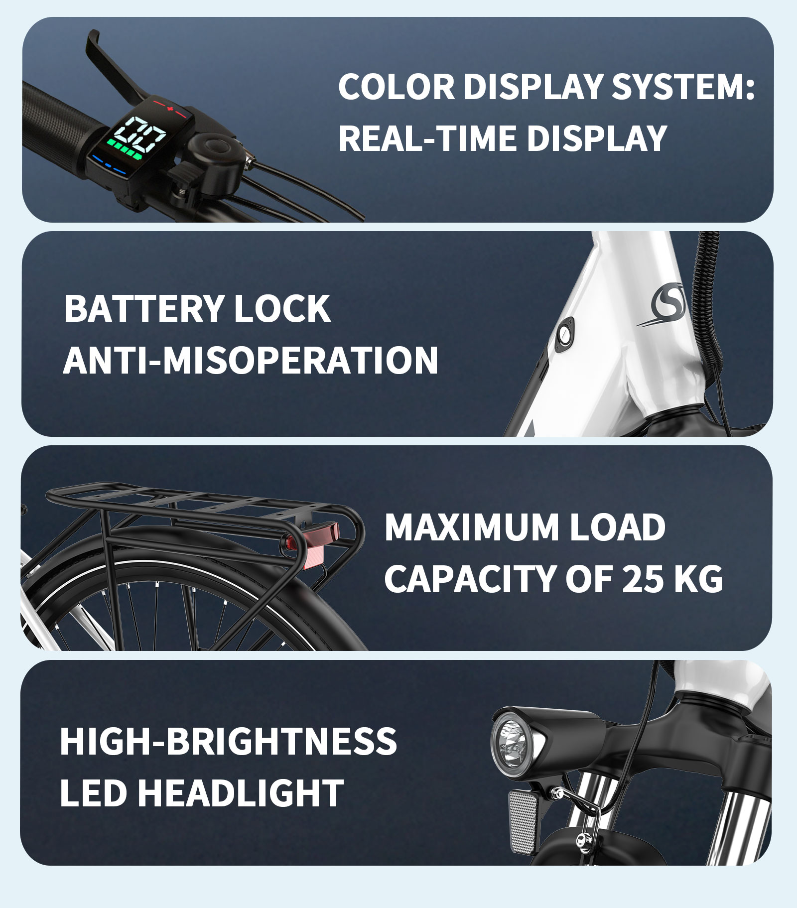 Large 36V 13AH battery for up to 65 km range in assisted mode